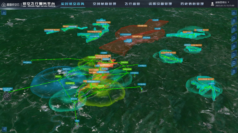 中科星图“领航·低空飞行服务管理平台”打造城市级低空管理“智能枢纽”。基于强大的低空数字孪生底座,将空域、航线、飞行器、基础设施等全要素数字化,构建了一个 “可计算、可调度、可监管”的低空交通操作系统。