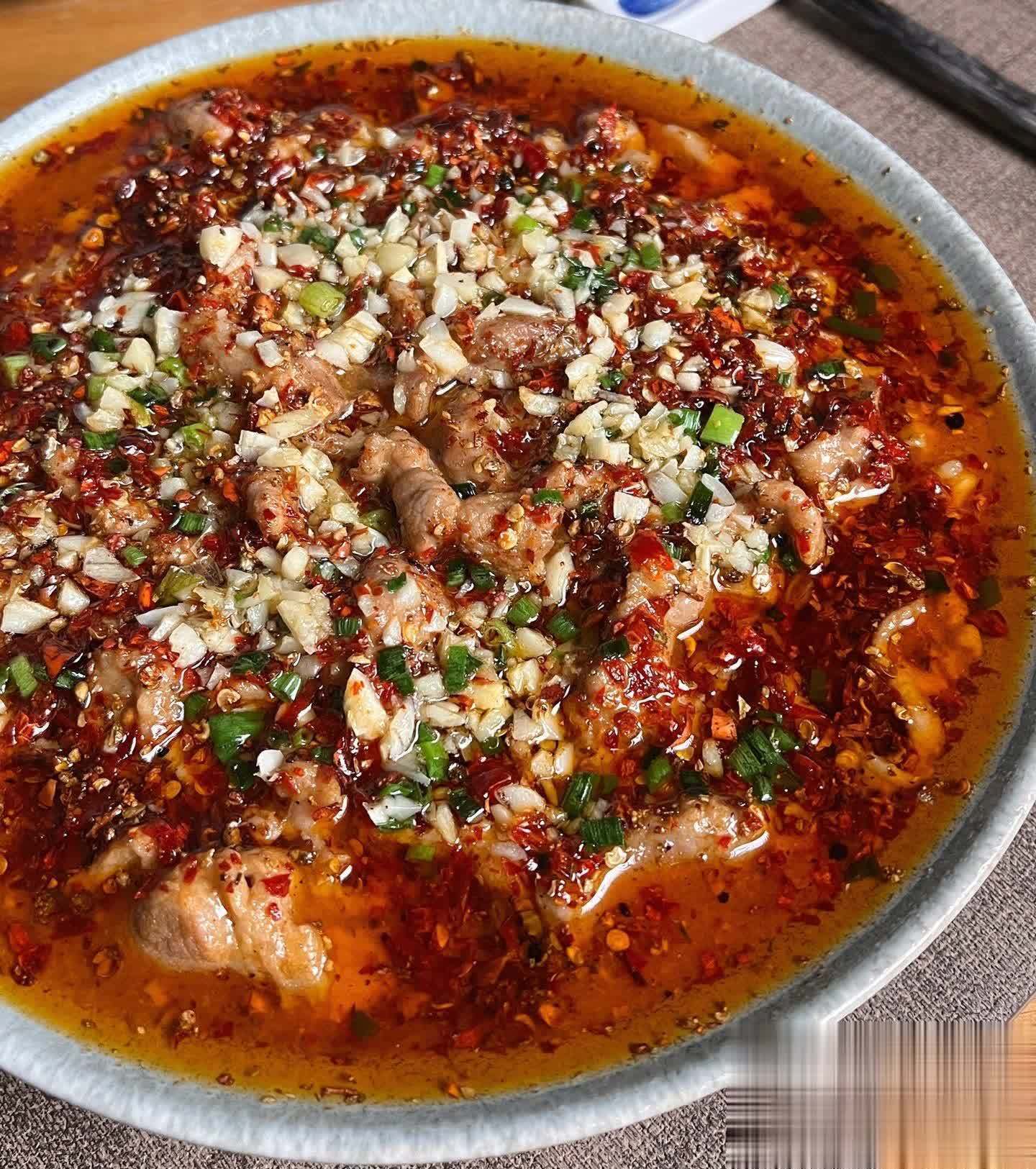 6.最后在肉片上撒上葱蒜末,干辣椒段,花椒粒以及白芝麻。锅中烧适量的热油,待油冒烟之后,把热油淋在调料上,“嗞啦”一声那香味刹那间四溢开来,这般操作之下,水煮肉片便做好了。