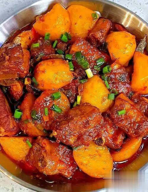 3.加热水、生抽,中火焖煮 30 分钟,加土豆和盐,继续焖煮 10 分钟,开盖大火收汁,加鸡精炒匀,撒葱花即可。